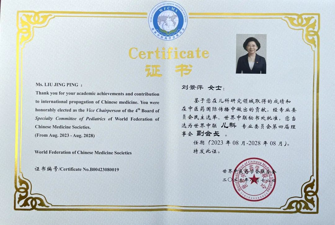 亚投药业集团党委书记、董事长刘景萍当选世界中医药学会联合会儿科专业委员会第四届理事会副会长